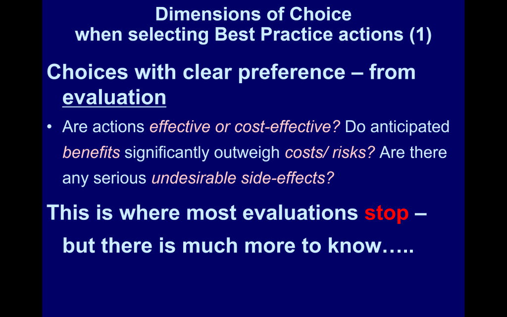 - Identification and application of Best Practice in Crime Prevention – some fundamental questions and some attempted answers. Presentation at European Crime Prevention Network (EUCPN) Best Practices Conference, Finland (2006). This covers functions and levels of evaluation at project, programme and policy levels. It attempts a consistent suite of definitions of terms such as input, output, outcome etc. It also puts forward a set of evaluation criteria for guiding the choice of preventive actions from a knowledge base, which go far beyond the conventional ‘impact/cost-effectiveness’ questions, as the slides below set out.