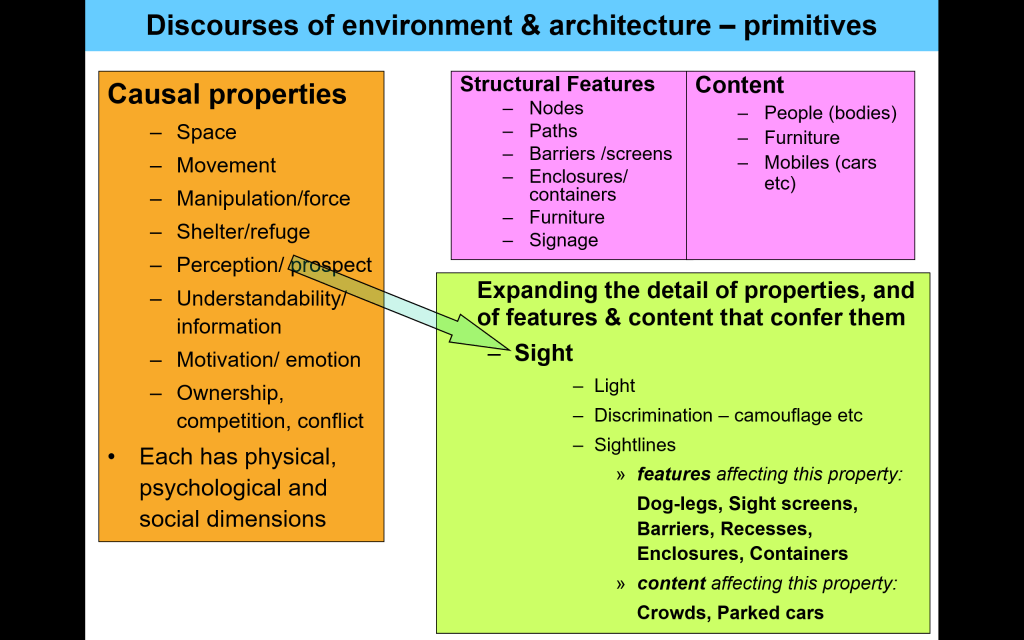 Some of these primitives came from Crime Science but were supplemented by a wider and more generic framework of ecology. Examples of such primitives are the causal properties of spatial containment, movement and perceivability, as influenced by structural features of the built environment and any content (such as walls or parked vehicles obscuring perceivability). These three kinds of primitives can be brought together, as in the green box of the following diagram, which also incorporates the concept of different discourses for describing preventive interventions: