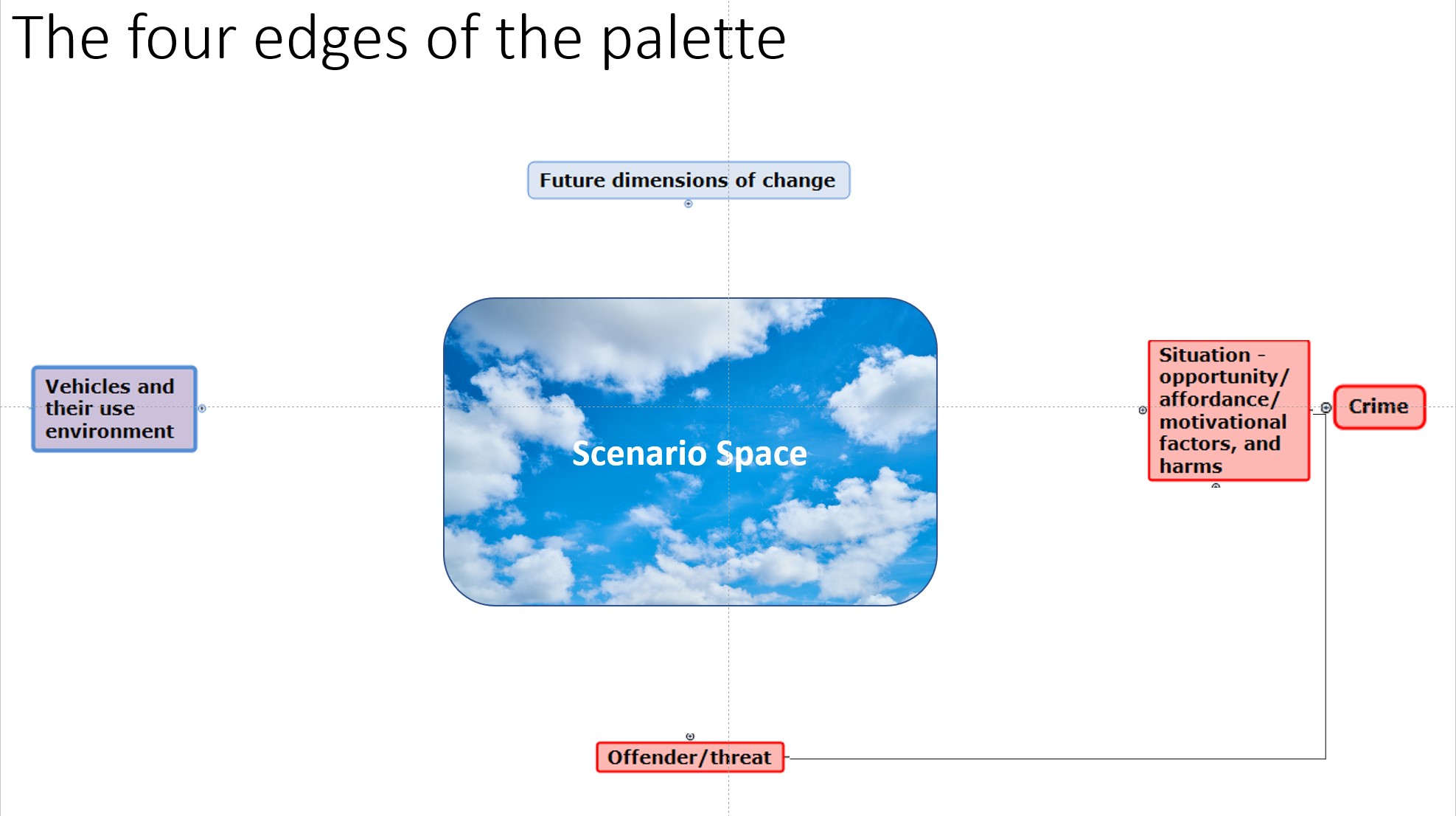 The palette has four edges representing the above four dimensions, and a large blank area in the middle, representing the space of possibilities which need to be considered, as this diagram shows: